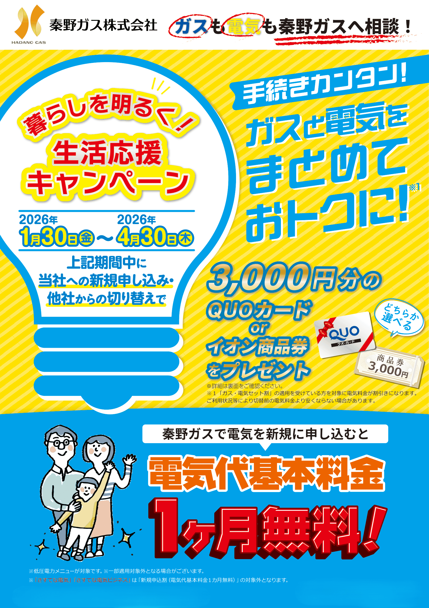 対象条件:2026年1月30日(金)〜2026年4月30日(木)まで(当日消印有効)に「基本プラン」または「秦野ガスでんき3」「秦野ガスさすてな電気」を新規にお申込みいただき(メニュー変更は対象外)、かつ電気の需給開始日が2026年1月23日(金)~2026年7月31日(金)までの方。